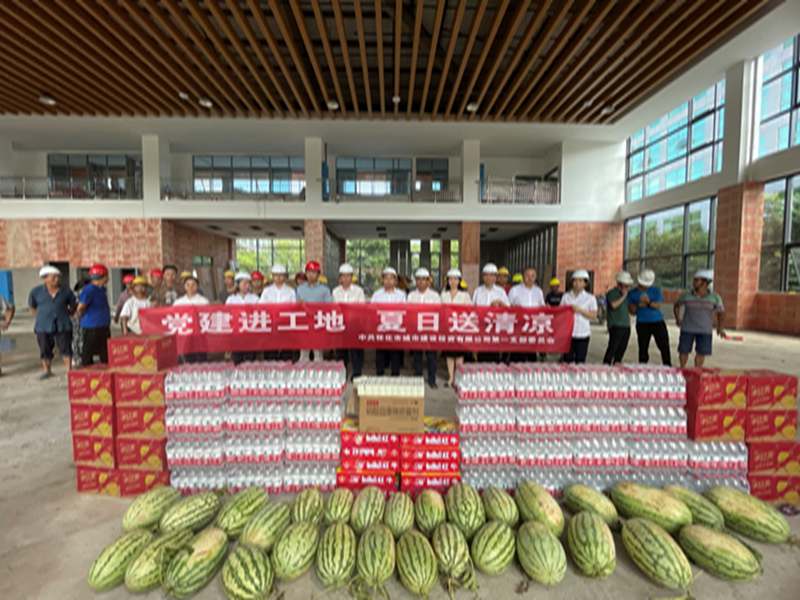 為切實(shí)關(guān)愛(ài)關(guān)懷施工一線(xiàn)人員, 7月21日下午,中共懷化市城市建設投資有限公司第一支部委員會(huì )組織黨員干部深入在建項目施工現場(chǎng)開(kāi)展“黨建進(jìn)工地 夏日送清涼”主題黨日活動(dòng)。給在高溫下工作的一線(xiàn)建筑工人們送去了礦泉水、西瓜、紅牛、藿香正氣水等防暑降溫物資。