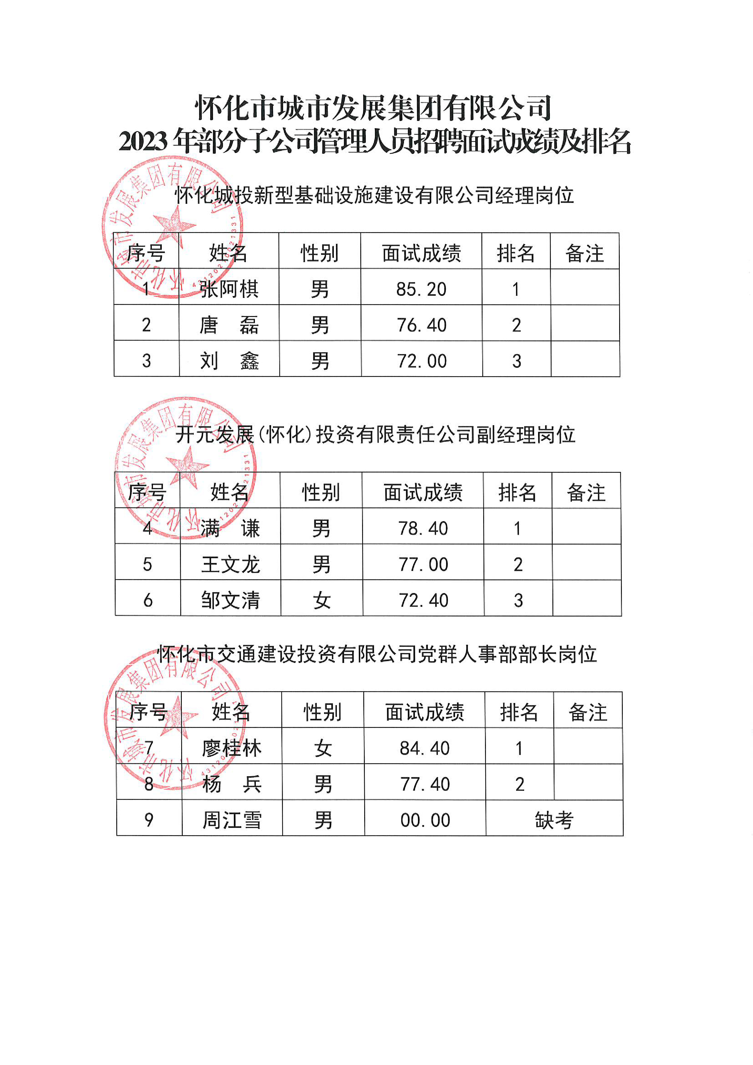 懷化市城市發(fā)展集團有限公司2023年部分子公司管理人員招聘面試成績(jì)及排名
