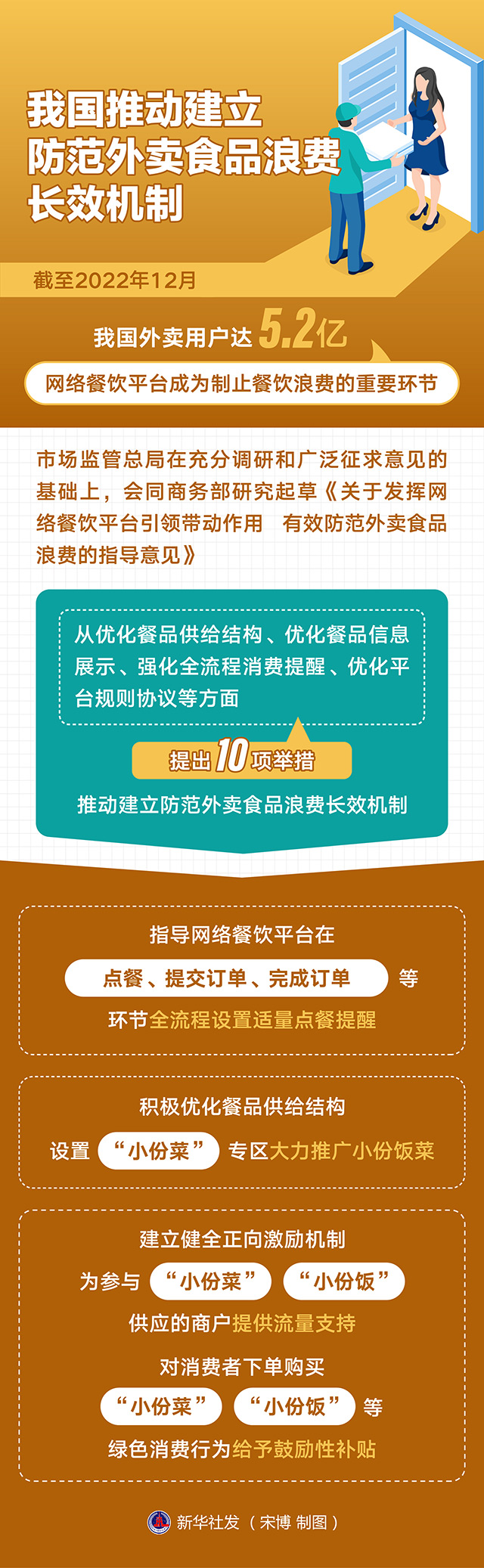 截至2022年12月,我國外賣用戶達5.2億,網(wǎng)絡餐飲平臺成為制止餐飲浪費的重要環(huán)節(jié)。市場監(jiān)管總局將進一步發(fā)揮平臺示范引領(lǐng)作用,推動建立防范外賣食品浪費長效機制。