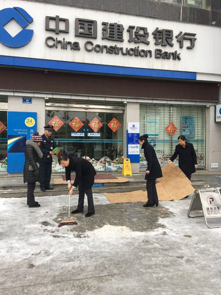 1月25日,建行懷化分行網(wǎng)點啟動應急預案,鏟冰掃雪、鋪設紅地毯,進一步做好冰災期間營業(yè)網(wǎng)點的客戶服務工作(王承 攝)