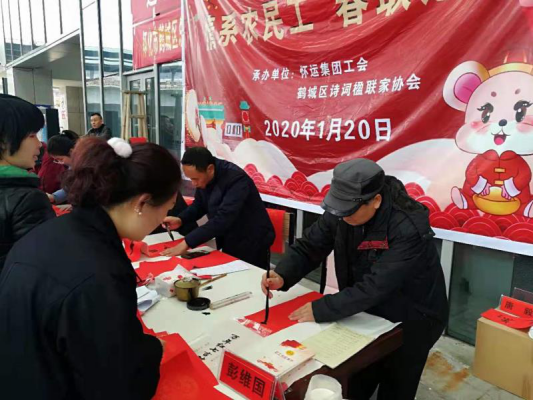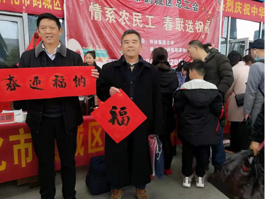 1月20日,懷運集團工會聯(lián)合鶴城區(qū)詩詞楹聯(lián)協(xié)會在懷化綜合客運樞紐站開展“情系農(nóng)民工,春聯(lián)送祝福”活動。