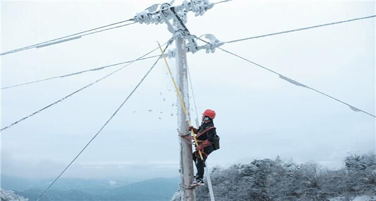 2018年12月31日上午10時,國網(wǎng)芷江供電公司工作人員在海拔1008米的明山頂峰進行上桿除冰作業(yè)。連日來,為保障人民群眾生產(chǎn)生活用電,該公司派出精干力量巡視129人次,特巡線路28條次,排除險情47處。(郭志剛 龔衛(wèi)國 攝)