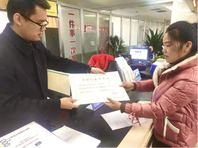 圖為“一件事一次辦”綜合窗口工作人員辦結(jié)柴女士申請(qǐng)辦理的我要開(kāi)印刷企業(yè)(不含出版物類)事項(xiàng)后為其發(fā)放相關(guān)證件。