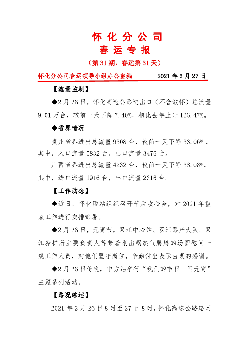 省高速集團(tuán)懷化分公司第31期春運(yùn)專報(bào)