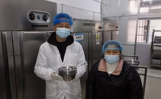 ▲工作人員在學校后廚餐飲具存放柜抽取樣品