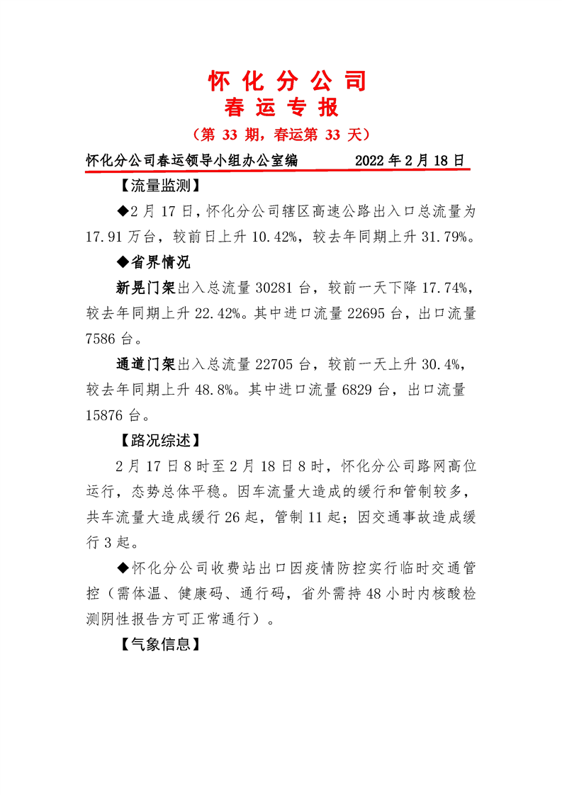 2022年高速懷化分公司第33期春運(yùn)專報(bào)