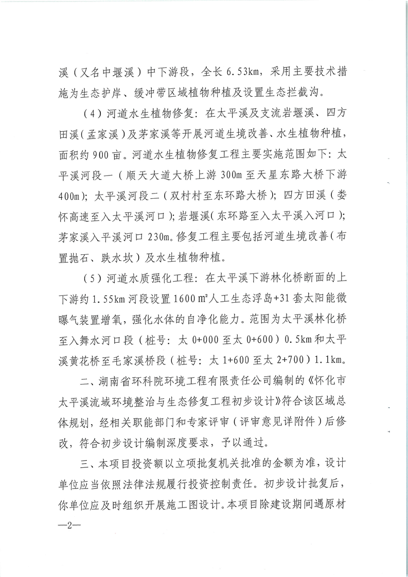 關(guān)于《懷化市太平溪流域環(huán)境整治與生態(tài)修復(fù)工程初步設(shè)計》的批復(fù)
