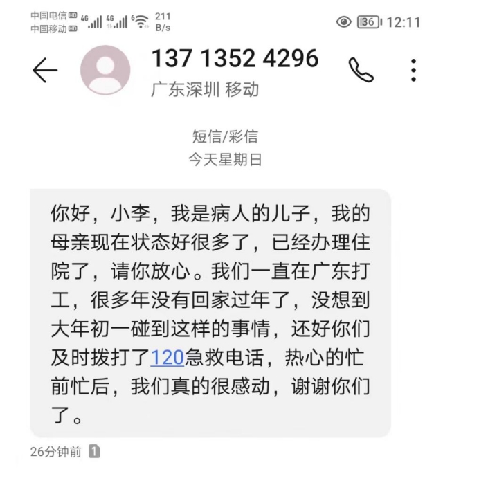 待老人各項體征平穩(wěn)后,收費班長李高強收到了一條感謝短信,對收費站的暖心幫助表示感謝。