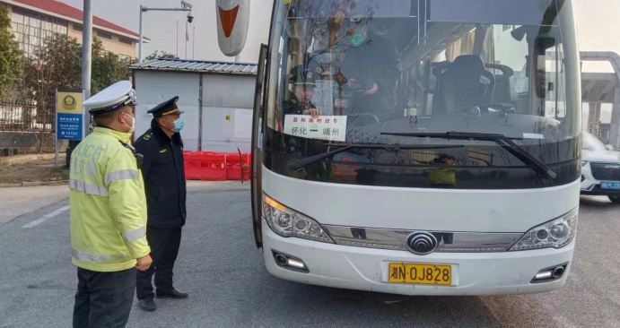 1月11日,靖州縣交通運輸綜合行政執(zhí)法大隊執(zhí)法人員與高速交警對入靖客運車輛進行檢查