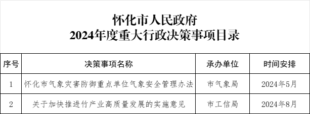 懷化市人民政府2024年度重大行政決策事項(xiàng)目錄