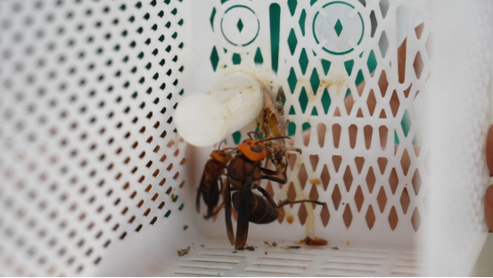 “我們養(yǎng)的是虎頭蜂(馬蜂的一種),本地叫土地蜂,早上要先給它們喂些營養(yǎng)液,里面是蜂蜜水,還添加了葡萄糖、益生菌,主要是用來給它們補充能量的。” 彭章裕介紹道,除了營養(yǎng)液,螞蚱是馬蜂的主要食物,當天早上已經(jīng)投喂過糖水,稍后還要繼續(xù)喂食螞蚱。