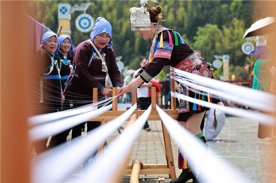 4月18日,通道牙屯堡鎮(zhèn)大戊梁文化廣場(chǎng),侗族婦女在織侗錦。近年來(lái),該縣通過(guò)“非遺+文旅”模式,讓傳統(tǒng)技藝帶動(dòng)了眾多侗族婦女在家門(mén)口實(shí)現(xiàn)就業(yè)增收。
