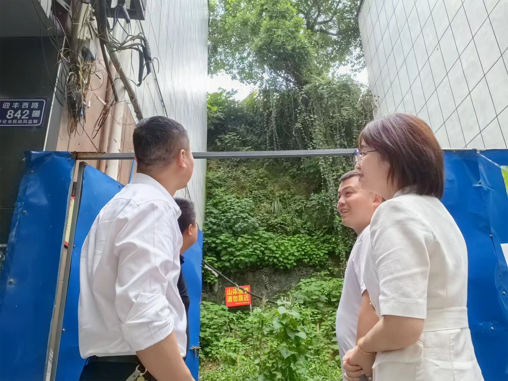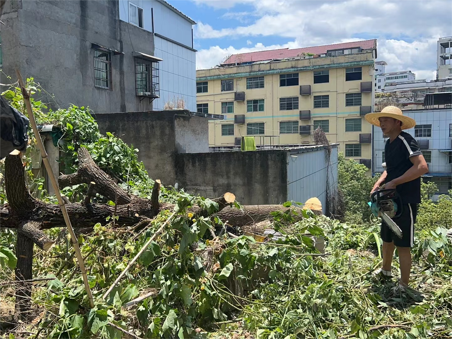 為保障人民群眾生命財產(chǎn)安全,消除安全隱患,市城建投公司在防汛期間開(kāi)展安全隱患點(diǎn)排查過(guò)程中,發(fā)現芷江路社區位于迎豐西路842號門(mén)店背后高邊坡一棵香樟樹(shù)下土壤流失嚴重,存在傾倒風(fēng)險,危及房屋安全。作為該社區的后盾單位,市城建投立即派全資子公司工程建設公司專(zhuān)業(yè)人員現場(chǎng)查看,及時(shí)對接,并于7月18日上午,組織城發(fā)物業(yè)公司5名工作人員帶著(zhù)安全繩、電鋸等工具到達現場(chǎng)開(kāi)始作業(yè)。