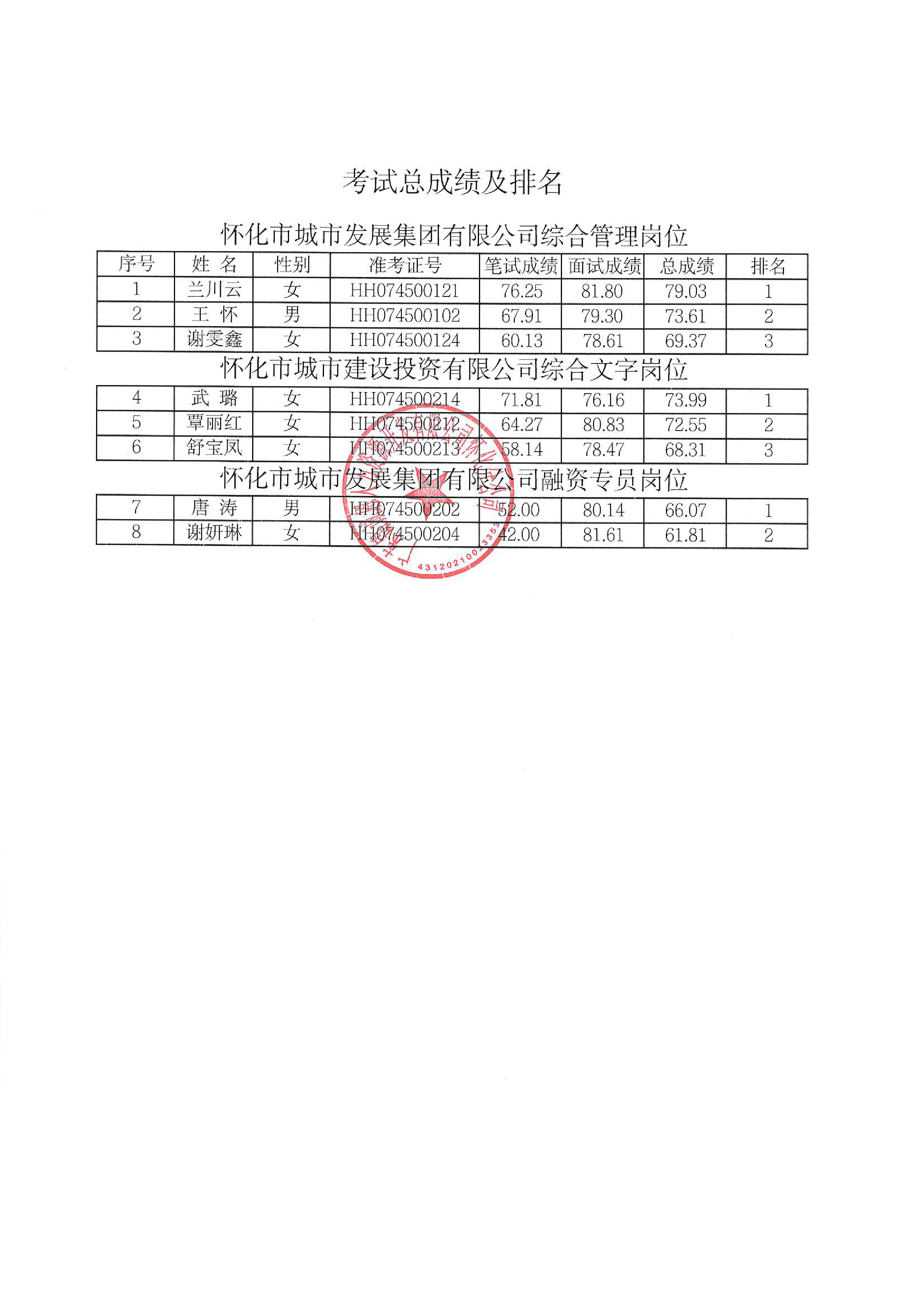 懷化市城市發(fā)展集團有限公司2023年校園招聘面試入圍考生考試總成績(jì)及排名
