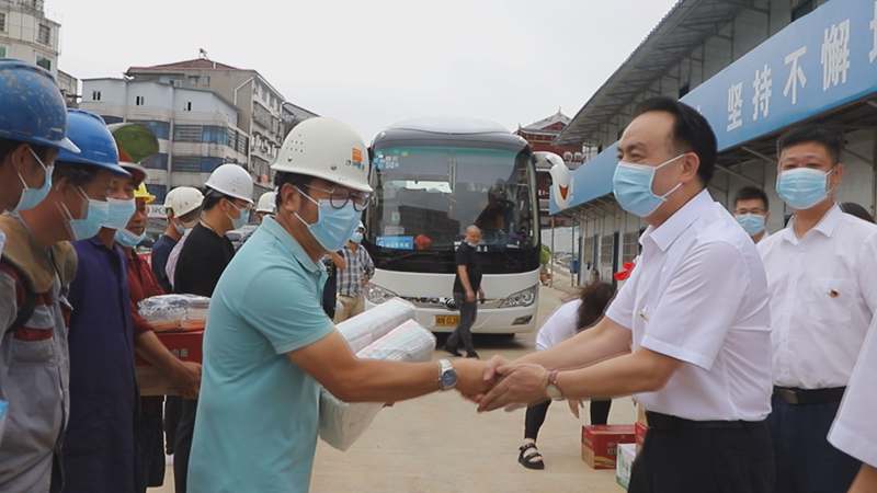 領(lǐng)導班子成員將慰問(wèn)品和防疫物資遞交給施工人員