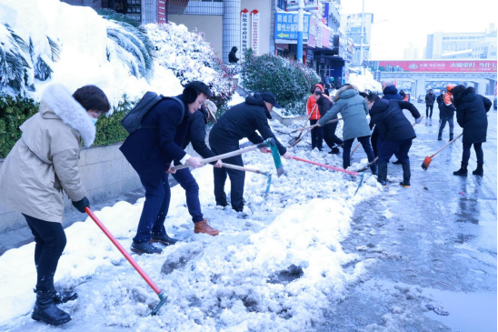 工作人員們發(fā)揚不怕苦、不怕累、不畏嚴寒的精神,分工合作,鏟的鏟,掃的掃,干得熱火朝天,很快厚厚的積雪就被大家清理干凈了。大家在除雪的同時(shí),還不斷提醒路人“小心地滑,注意安全”。