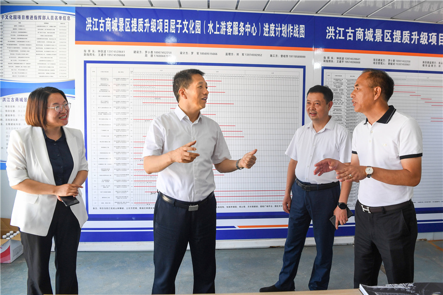 (許忠建在洪江古商城了解屈子江閣、水上游客服務(wù)中心等景區(qū)提質(zhì)改造項(xiàng)目進(jìn)展情況。以上照片均由懷化日?qǐng)?bào)全媒體記者 楊智偉 攝)