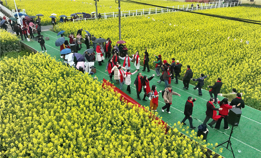 如畫的美景不僅留住了本地人的心,也吸引了周邊地區(qū)的游客慕名而來(lái)。來(lái)自湘西瀘溪縣老年大學(xué)健身班的學(xué)員們身著艷麗服飾,在花海中翩翩起舞。學(xué)員龔來(lái)桂興奮地說:“這里的油菜花太漂亮了,我們?cè)谶@里唱歌跳舞,特別高興!”