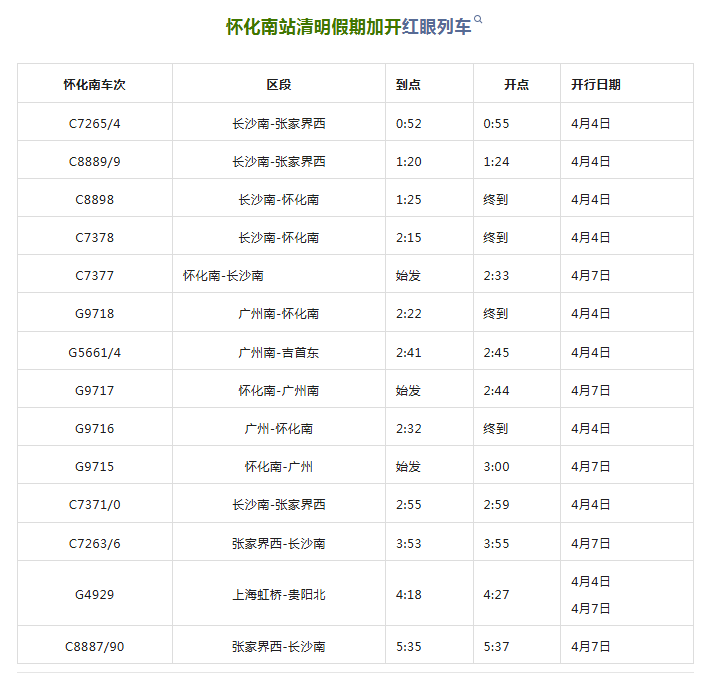 清明假期將至,為方便大家錯(cuò)峰祭掃、踏青出行,懷化南站2026年清明期間(4月3日-7日)將加開多趟夜間高鐵,重點(diǎn)覆蓋長沙南、廣州南等熱門方向,全力保障深夜出行需求。